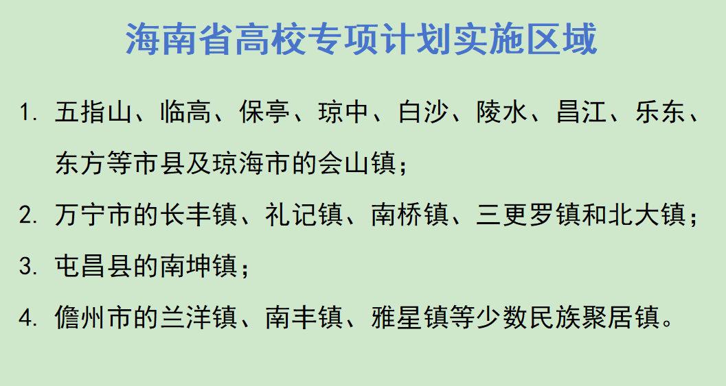 高校专项计划的实施地区与国家专项计划有部分重叠,但覆盖范围更广。除了上述提到的县(市、区)外,还包括了万宁市的长丰镇、南桥镇等地。海南省高校专项计划实施区域具体如下: