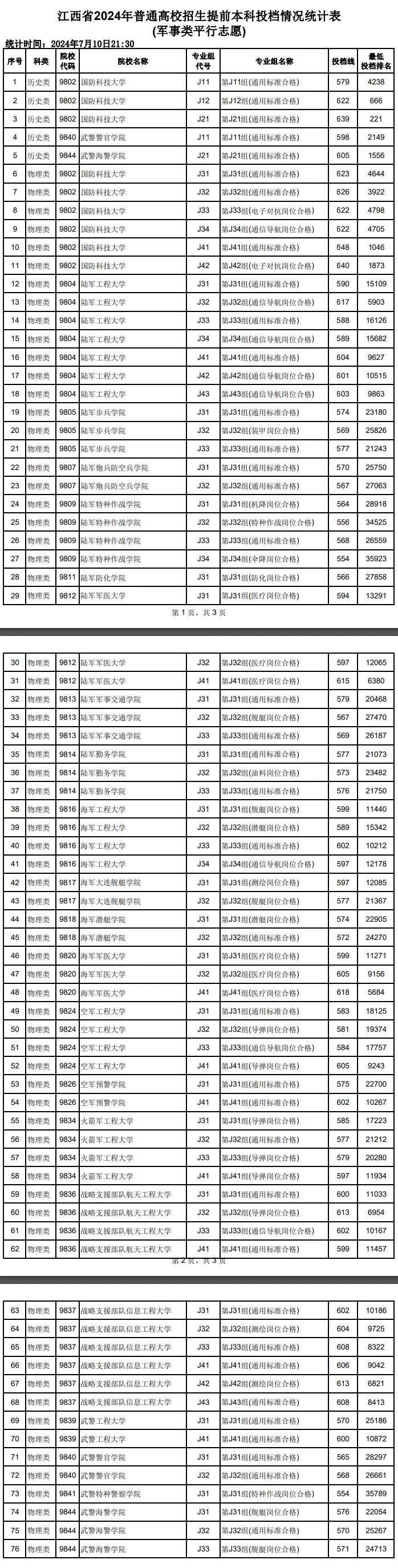 在2024年江西高考中,国防科技大学投档线最高的是J41组(通用标准合格),为648分;投档线最低的是J33组(电子对抗岗位合格)、J12组(通用标准合格)和J34组(通信导航岗位合格),均为622分。具体各专业组投档线详情如下: