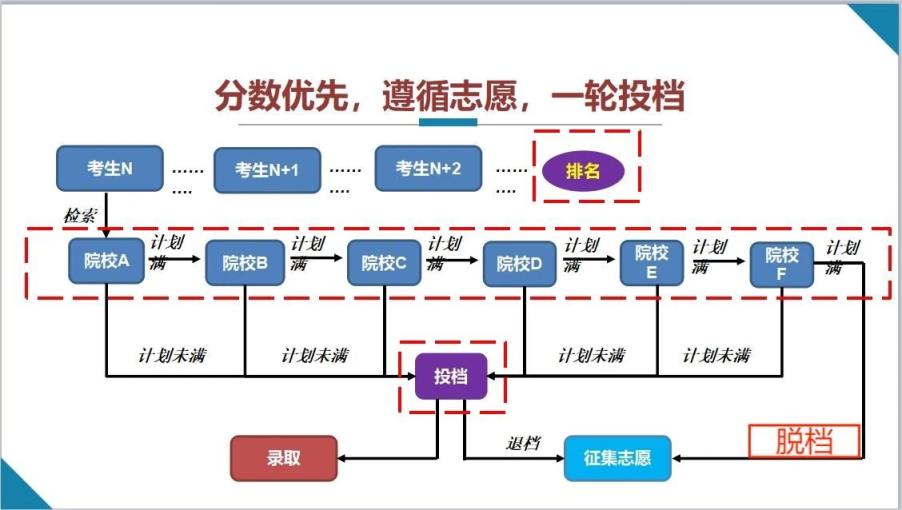 而平行志愿的投档规则是分数优先,遵循志愿,一轮投档,即分数大于志愿,虽然志愿是平行的,但在对考生个人志愿检索时还是按照志愿顺序逐个进行,所以考生们也要注意填报顺序和高校志愿之间的梯度,做到“冲-稳-保”,才能有效降低退档滑档几率。