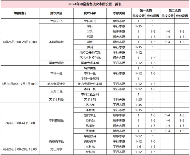 2024年河南高考录取批次顺序依次是强基计划通知录取、海/空军招飞、本科(非艺术类)提前批、国家专项计划本科批、本科一批、地方专项计划本科批、本科二批、专科提前批、高职高专批。以下将为大家讲解各个批次的高考志愿填报个数: