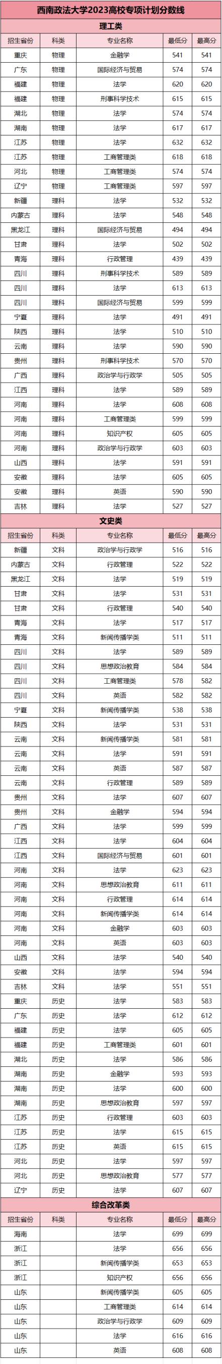 西南政法大学2023高校专项计划在重庆、广东、福建、江苏、河北、四川等省份文史类、理工类均有进行招生,招生专业有金融学、刑事科学技术、法学、新闻传播学类等专业。以下是西南政法大学2023高校专项计划分数线汇总,可供2024高考考生查看。