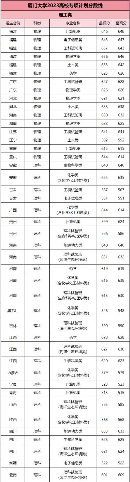 厦门大学是一所985、211院校,在2023年高校专项计划中针对安徽、福建、甘肃、宁夏、河南等多个省份进行了招生,招生专业和人数较多,例如:电子信息类、药学、工科试验班、法学类、能源动力类、人文科学实验班类等专业。以下是厦门大学2023高校专项计划在不同专业中的录取分数线,供查阅。
