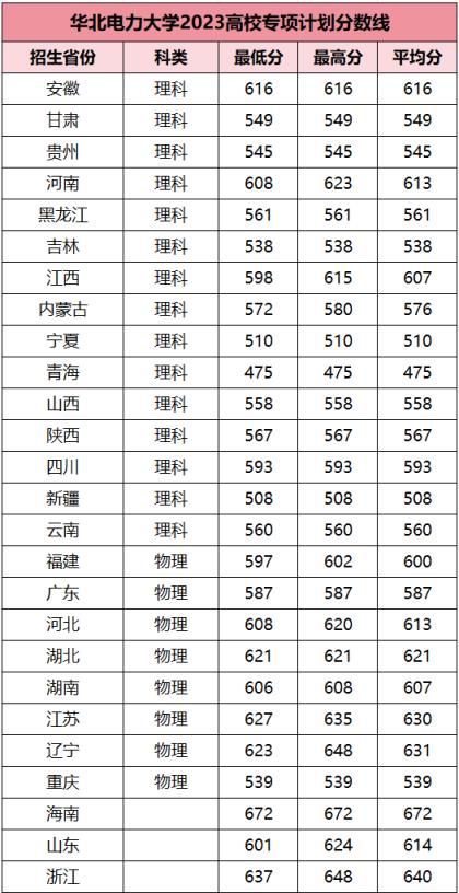华北电力大学在2023高校专项计划中仅招收了理工类考生,以下是该大学在各省份招录高校专项计划的分数线详情。