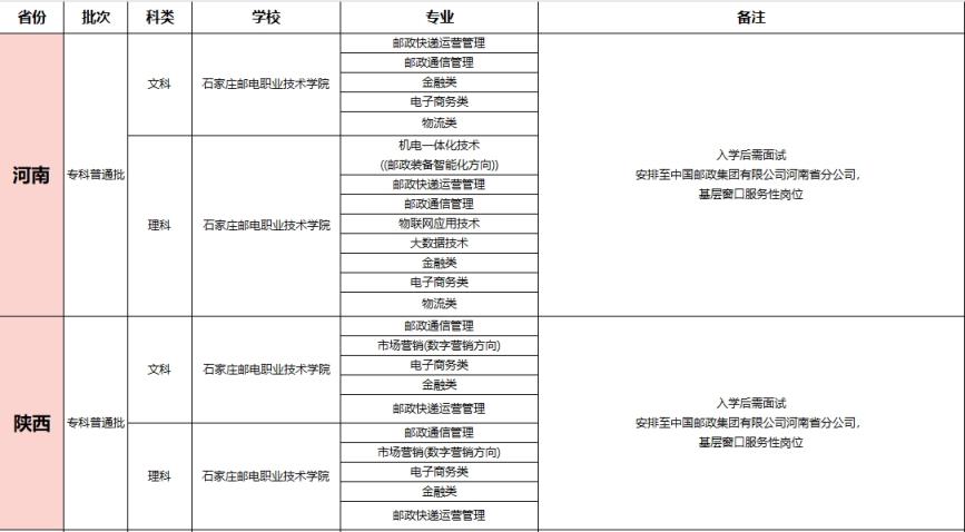 2024年在河南和陕西都只有石家庄邮电职业技术学院的邮政订单班进行招生,主要招收邮政快递运营管理、邮政通信管理、邮政快递运营管理、金融类、物流类等专业的学生,毕业后主要面向中国邮政集团有限公司河南分公司,基层窗口服务性岗位进行工作。