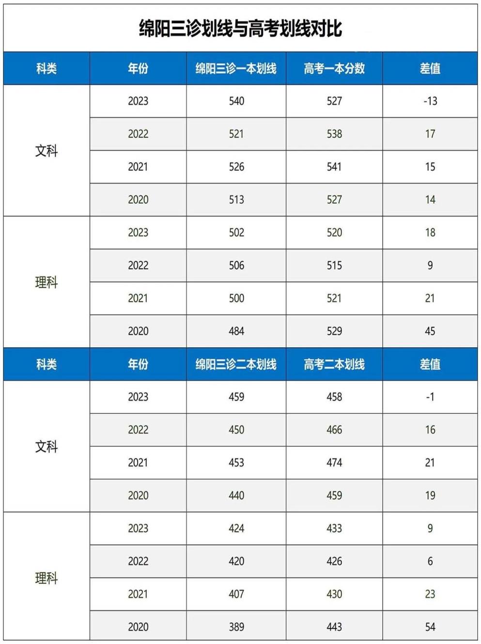 根据近4年来,绵阳三诊与高考划线之间的对比来看,绵阳三诊分数划线大多高于高考分数划线,差值一般在20分以内,考生们在参考绵阳三诊划线时,可相应减去20分作为高考成绩的参考。