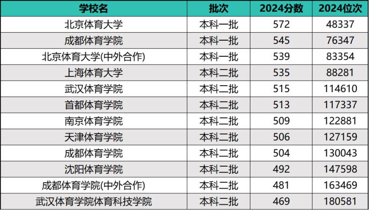 其中,录取分最低的三所公办体育类院校是成都体育学院(中外合作)、沈阳体育学院和成都体育学院,录取分是481分、492分和504分,适合高考位次在十四万七千名的考生选择。