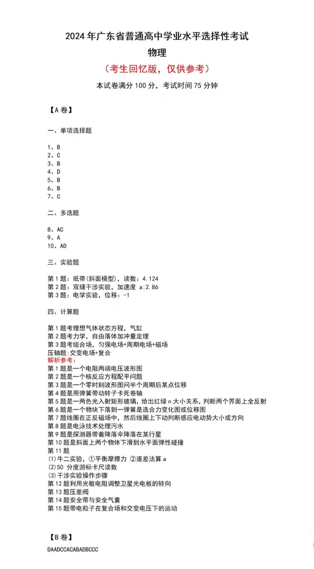 2024年高考物理广西卷考试结束后,本文将第一时间公布相关的真题试卷及答案!