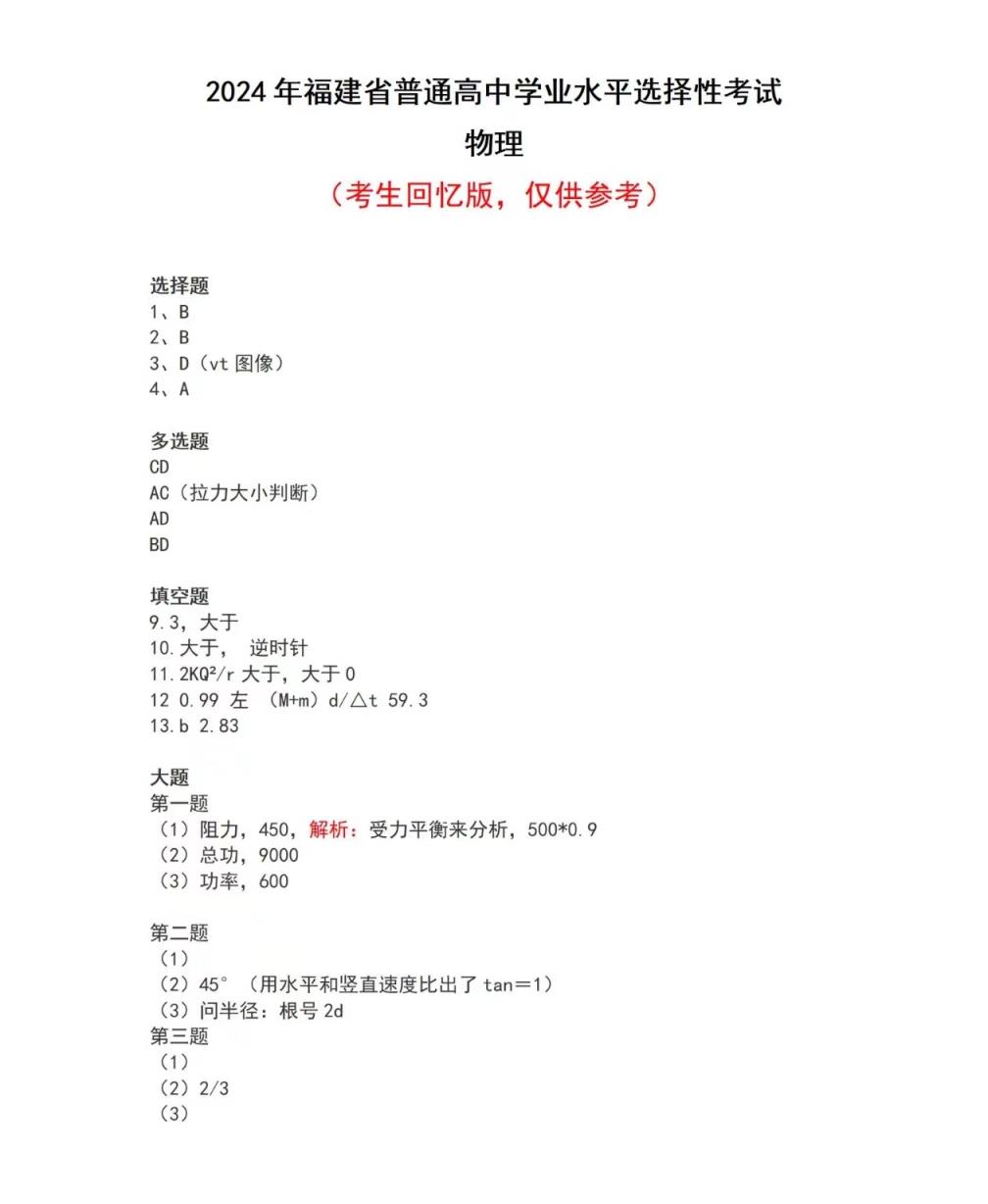 2024年高考物理福建卷真题及答案,将在考试结束后公布,请大家持续关注本文!