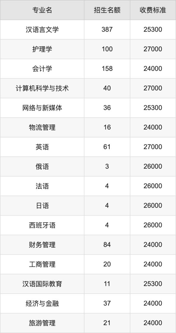 西安外事学院在文科本科二批招生的各个专业,每年的学费是24000元-29600元。招生人数最多的专业是汉语言文学,2024年招387人,学费是25300元。