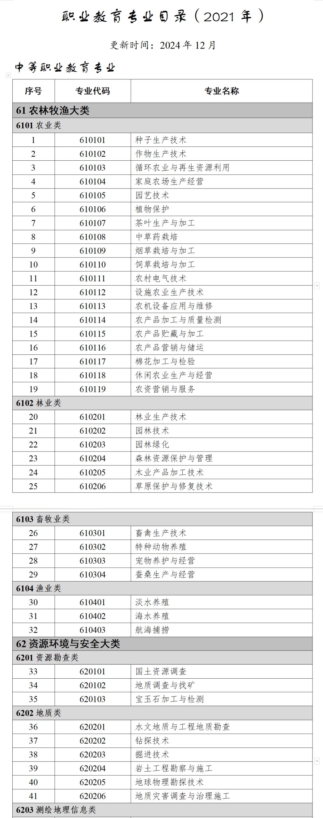 (一)农林牧渔类:包括园艺技术、畜牧兽医、水产养殖技术等,旨在培养能够服务于农业、林业、牧业和渔业的高素质技能人才。