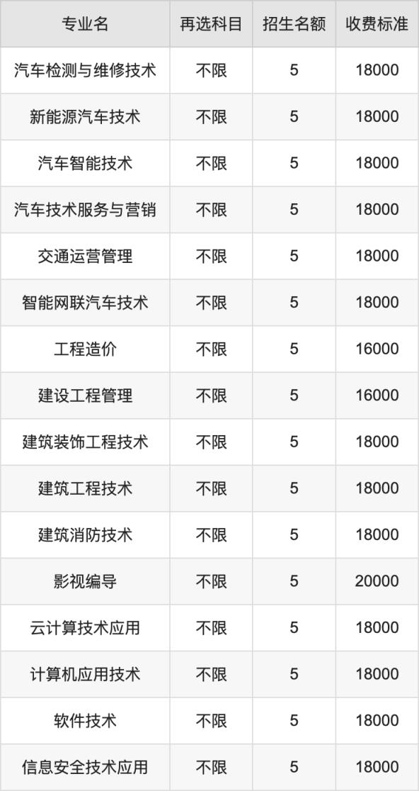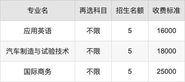 无锡南洋职业技术学院在历史组专科批招生的各个专业,每年的学费是16000元-25000元。招生人数最多的专业是汽车检测与维修技术,2024年招5人,学费是18000元。
