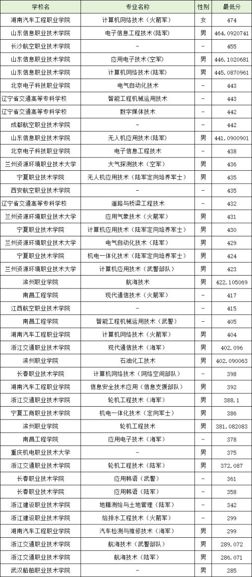 湖南汽车工程职业学院计算机网络技术(火箭军)专业分数线最高,为474分。