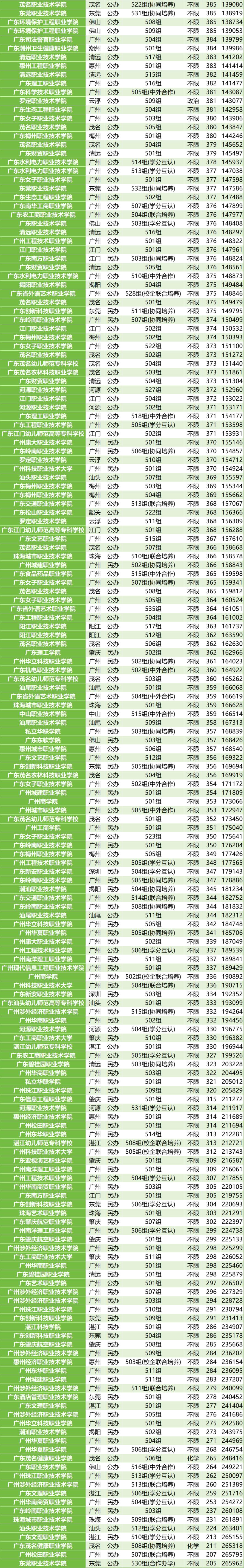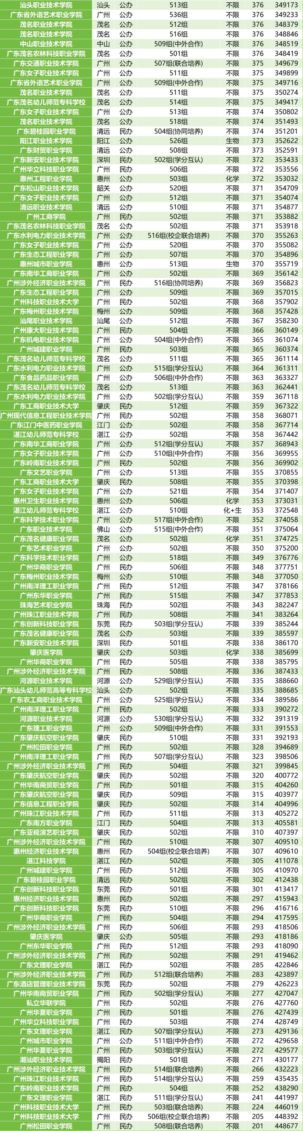 广东江门中医药职业学院、广东体育职业技术学院、惠州工程职业学院、汕头职业技术学院、广东文艺职业学院、广州体育职业技术学院、广东艺术职业学院、广东碧桂园职业学院、广东岭南职业技术学院、广东财贸职业学院、广州华夏职业学院、广州卫生职业技术学院、惠州卫生职业技术学院、广州华立科技职业学院、广东文理职业学院、广州华商职业学院、广东新安职业技术学院、广东司法警官职业学院、广东茂名幼儿师范专科学校、广州松田职业学院、广东亚视演艺职业学院、广州华南商贸职业学院、阳江职业技术学院、广东工商职业技术大学、汕尾职业技术学院、广州东华职业学院、广东南方职业学院、罗定职业技术学院、湛江幼儿师范专科学校、广东创新科技职业学院、广州涉外经济职业技术学院、揭阳职业技术学院、广州珠江职业技术学院、茂名职业技术学院、广州现代信息工程职业技术学院、珠海艺术职业学院、广州康大职业技术学院、广州科技职业技术大学、惠州经济职业技术学院、私立华联学院。