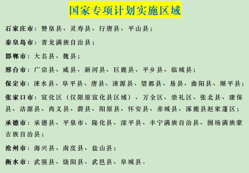 涵盖了多个脱贫县(市、区),如石家庄市的赞皇县、灵寿县等,秦皇岛市的青龙满族自治县,以及邯郸市、邢台市、保定市、张家口市、承德市、沧州市、衡水市的多个县(市、区)。河北省国家专项计划的实施区域具体如下: