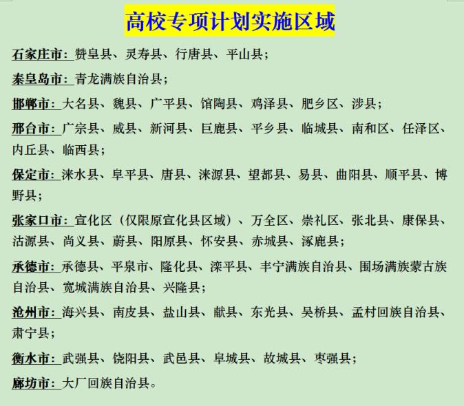 地方专项计划在河北省的实施区域为县(含县级市和自2014年起经国务院批准的县(市)改区)。这些地区涵盖了河北省内的所有县(市、区),为当地农村学生提供了更多的升学机会。