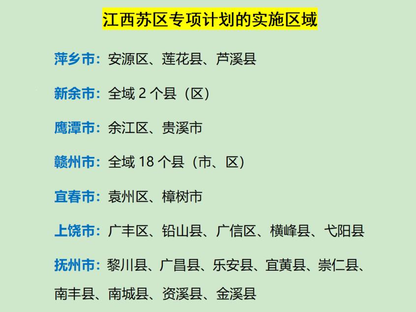 该项政策的实施区域覆盖了原54个中央苏区振兴发展规划县,包括萍乡市、新余市、鹰潭市、赣州市、宜春市、上饶市、吉安市、抚州市等地的多个县(市、区)。