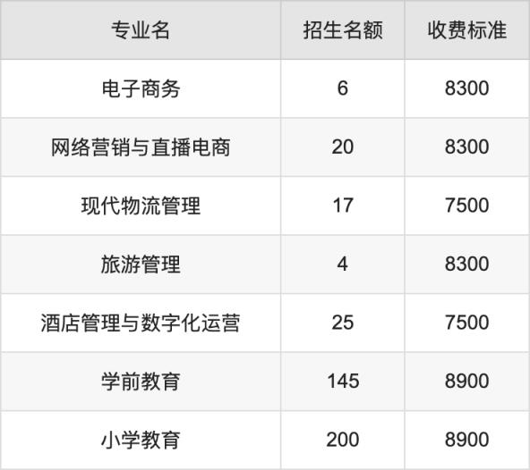 南阳职业学院在文科高职高专批招生的各个专业,每年的学费是7500元-11800元。招生人数最多的专业是小学教育,2024年招200人,学费是8900元。