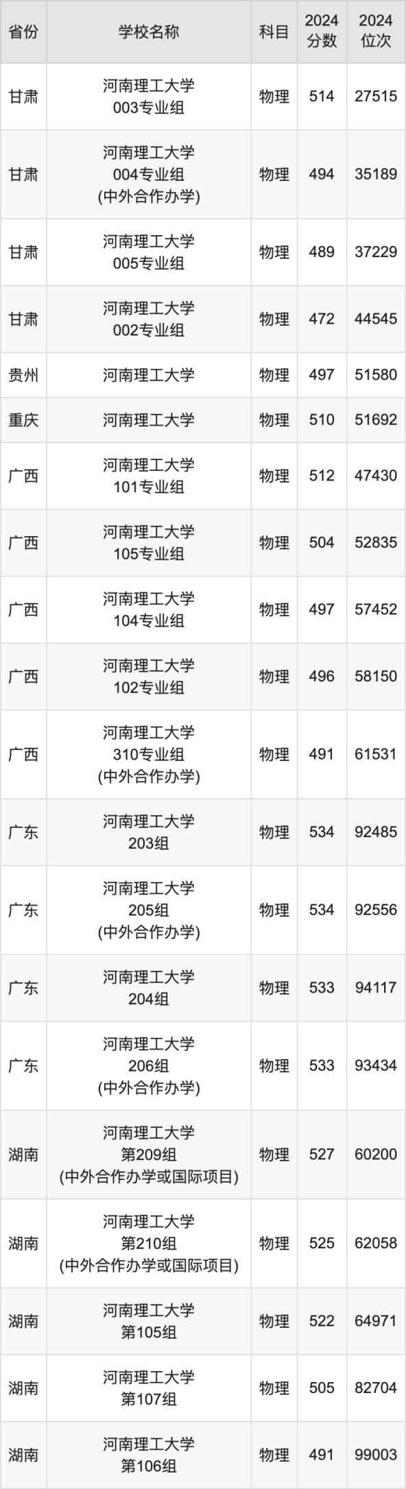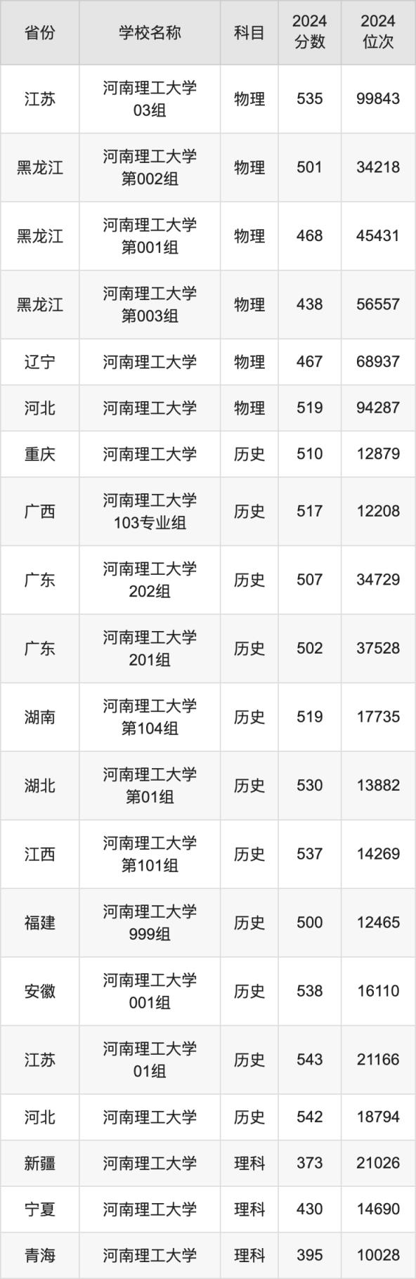 河南理工大学2024年面向河南省内理科的考生招生,分数线达498分,招生专业包含数字经济、金融学、法学、英语、日语、数学类、应用物理学、应用化学、自然地理与资源环境、人文地理与城乡规划。