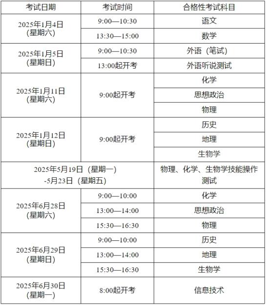 思想政治、历史、地理、物理、化学、生物学2025 年 1 月的合格性考试采用机考方式,多科混排同时开考;6 月的合格性考试采用闭卷笔试方式,且物理、化学和生物学合格性考试另设技能操作测试,测试时间均为 15 分钟。