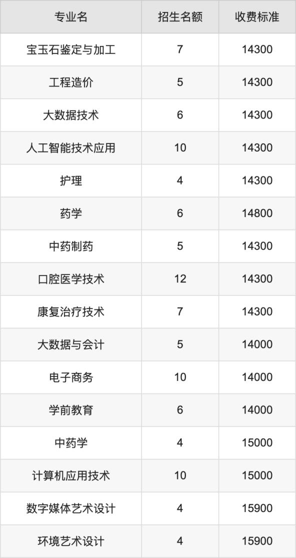 陕西国际商贸学院在文科高职专科批招生的各个专业,每年的学费是14000元-15900元。招生人数最多的专业是口腔医学技术,2024年招12人,学费是14300元。