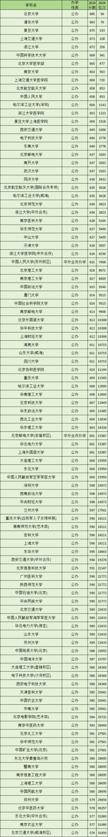 2024年全国部分重点大学录取分数线排名一览表如下: