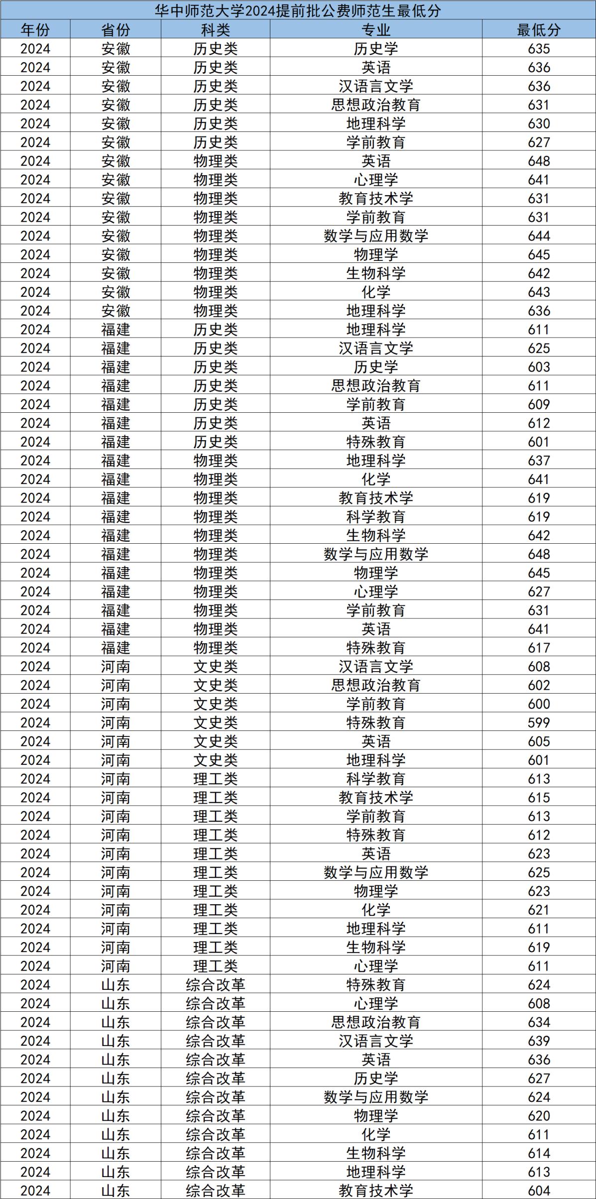 2024年华中师大在部分省份的最低分如下,除特殊教育在河南的文科分低于600之外,其余全部在600分以上,最高可达到648分。