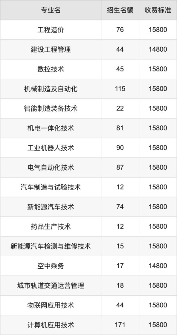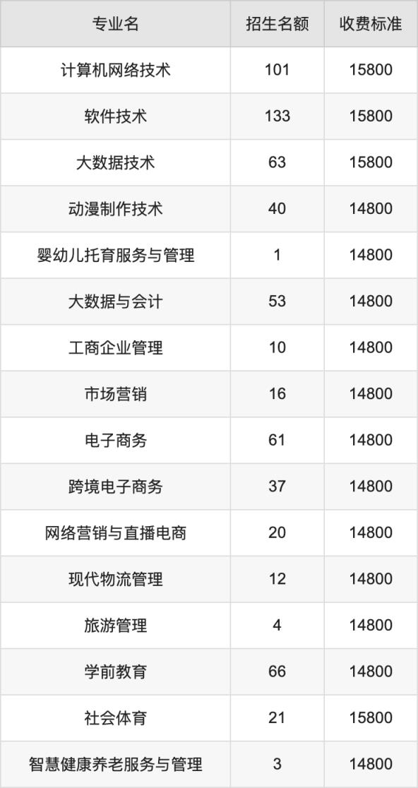 洛阳科技职业学院在文科高职高专批招生的各个专业,每年的学费是14800元-15800元。招生人数最多的专业是计算机应用技术,2024年招171人,学费是15800元。