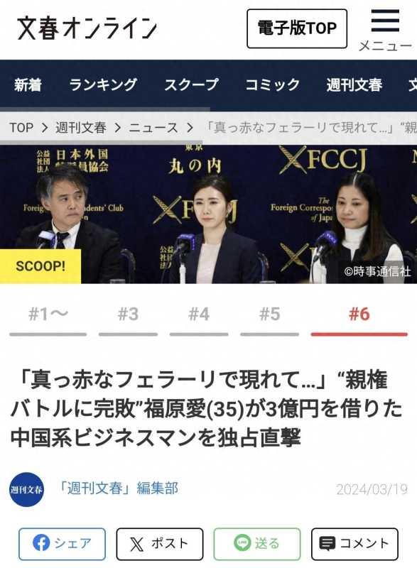《周刊文春》还称,福原爱和江宏杰在东京共同举行记者会,就孩子抚养问题达成和解。记者会两天后,《周刊文春》在上野看到了乘坐红色法拉利出现的神秘富豪。