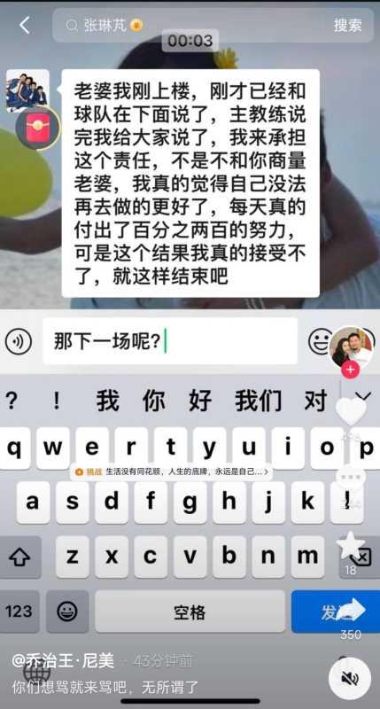 王乔治在社媒上张琳芃与其的聊天记录,并疑似回应其夫退出国家队言论:你们想骂就骂吧,无所谓了。而刘殿座回复到:心疼他,唉,不管怎样我都支持他,爱他。——王乔治则回复:你光支持就行,爱他让我来。