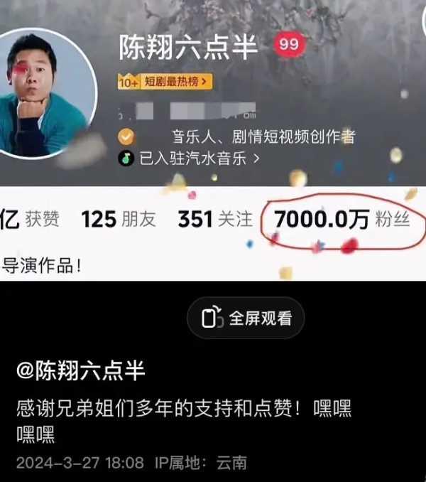 3月27日,被很多网友誉为短剧鼻祖之一的陈翔六点半更新最新视频,庆祝某平台粉丝突破7000万,感谢广大网友的喜欢和陪伴,陈翔虽然没有出镜,但是,可以感受到团队的开心之情。