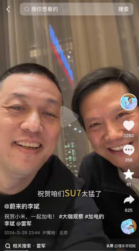 3月28日晚,小米汽车首款车型小米SU7发布会结束后,蔚来汽车创始人、董事长、CEO李斌发布视频,与小米集团董事长雷军再度“同框”,在祝贺小米SU7上市的同时,李斌也感慨小米SU7定价太猛,“我们后边乐道这个车都不好定价。”