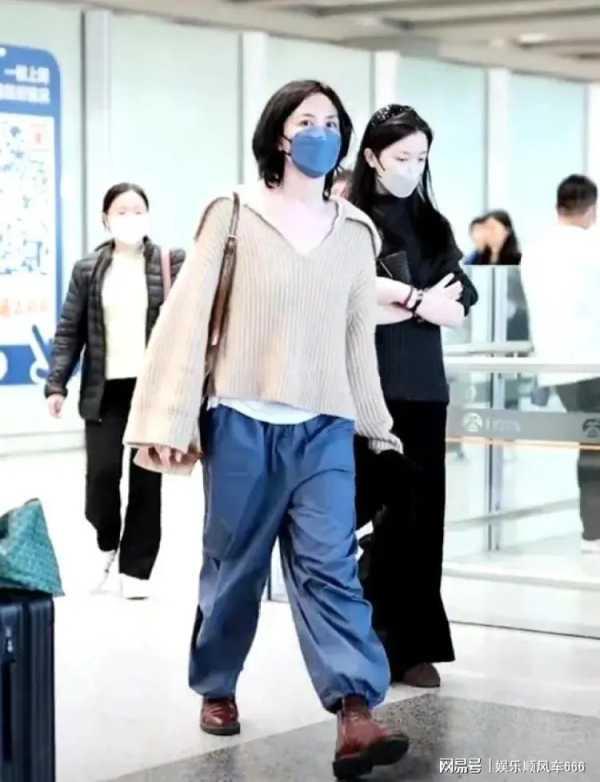 王菲的穿搭也十分养眼,休闲宽松,上衣是浅米色罗纹V领针织衫,下身是藏蓝色收口阔腿工装裤,脚蹬一双复古棕色皮鞋,和身上的背包遥相呼应。这一身行头普通人穿可能是路人甲,但王菲穿上就是行走的代言人,天后的气场无人能比。