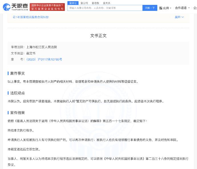 天眼查法律诉讼信息显示,近日,郑爽与海宁东开之星影视投资有限公司合同纠纷案件新增执行裁定书。文书内容显示,法院认为,经穷尽财产调查措施,该案被执行人郑爽暂无财产可供执行,故无继续执行的条件,应终结执行程序。