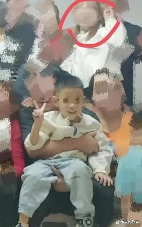 5岁男孩郑某某与生母陈某(后排红圈处)