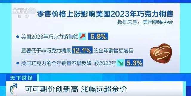 本周,纽约和伦敦两地的可可期货价格接连创出历史新高。今年以来,纽约可可期价累计上涨135%,去年3月至今的一年时间里,累计涨幅更是高达250%,远超黄金价格同期涨幅。数据显示,美国2023年巧克力销售额增长5.8%,显著低于非巧克力糖果12.1%的全年销售额增幅,巧克力的全年销量不增反降,较2022年萎缩5.3%。这表明,在高通胀的环境下,消费者对食品价格的波动尤为敏感。