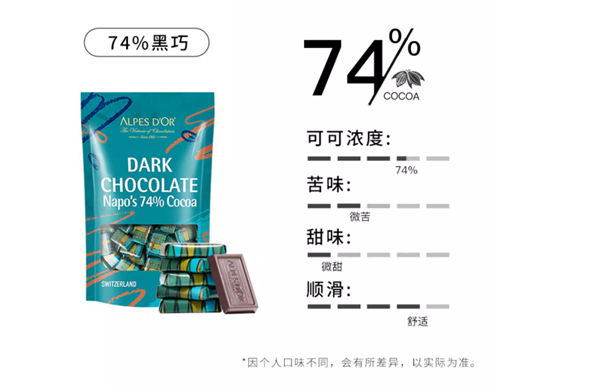 产品规格:约110颗,可可浓度74%,口感微苦不涩,细腻柔滑,口味香醇,适合刚吃黑巧的消费者。