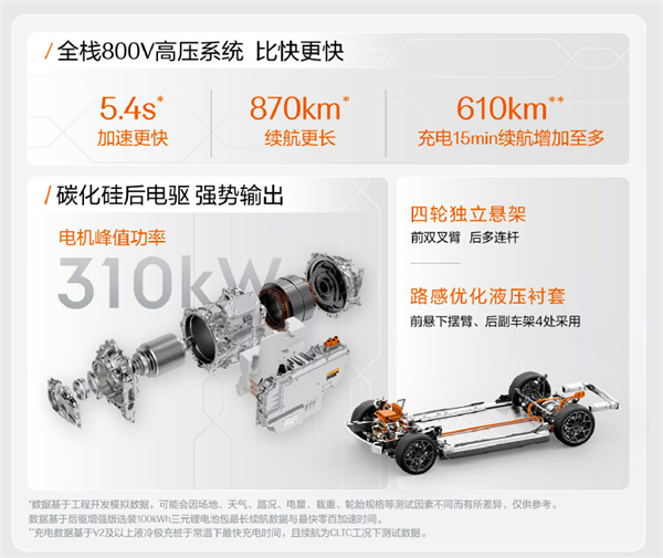 极氪007全系都采用800V架构,后驱增强版拥有688km续航里程,在同级磷酸铁锂电池轿车中排名第一,凭借800V架构,充电倍率最高可达4.5C,充电15分钟续航可增加500km。