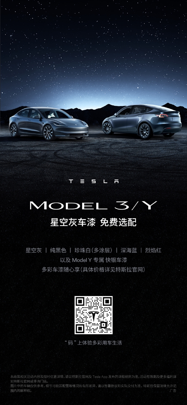 4月1日消息,特斯拉官方微博宣布,即日起,Model 3/Y免费选配原价1.2万元的星空灰车漆。
