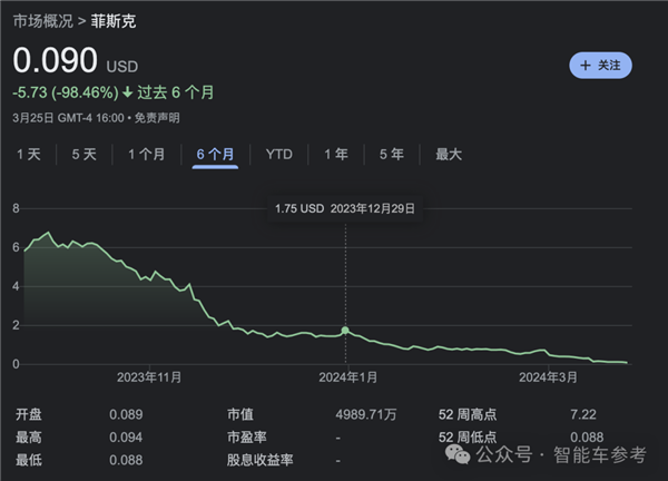 要知道,Fisker市值曾达到79亿美元(约570亿元),每股价格为28美元(约202元),而现在,市值已经只剩4990万美元(约3.6亿元),缩水超99%。