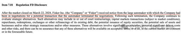 先是周一,Fisker提交的一份文件显示,与某大型OEM的投资合作谈判突然终止。