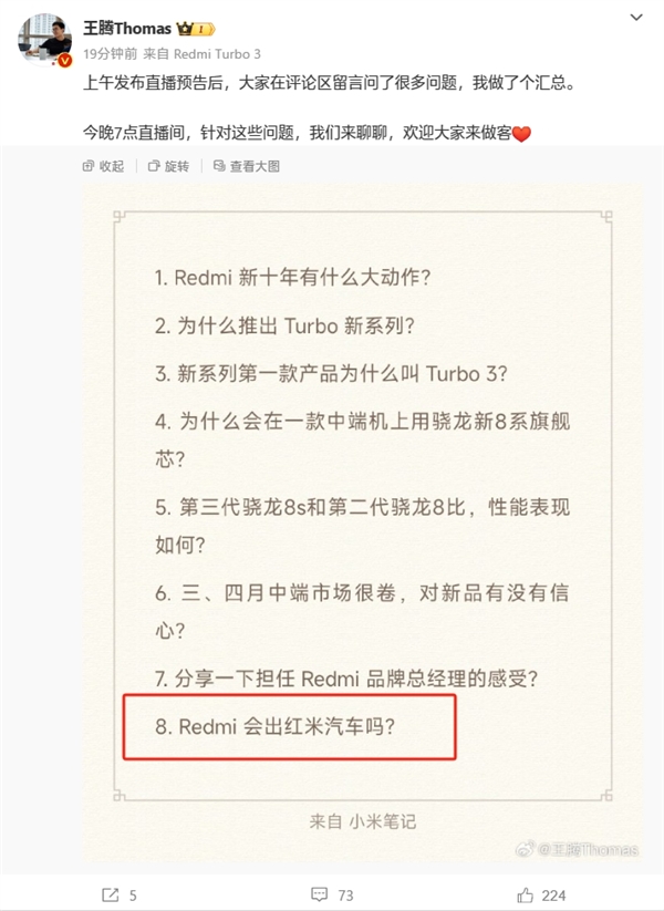 王腾本人已经开始为新产品Redmi Turbo 3预热,并表示将于今晚直播回答网友的问题。