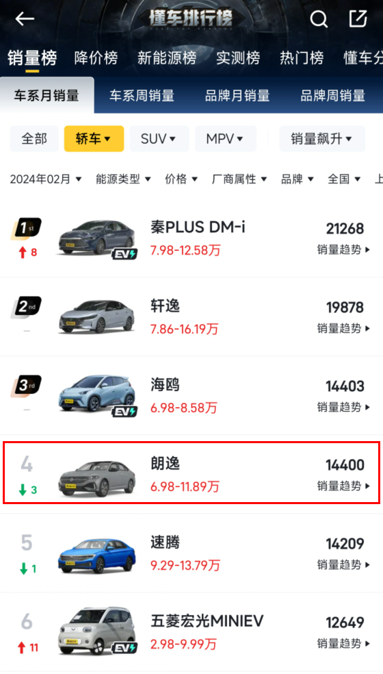 统计数据显示,2月份,大众朗逸的销量为14400辆,国内轿车销量榜排名第四,与销冠秦PLUS DM-i的21268辆有较大差距。