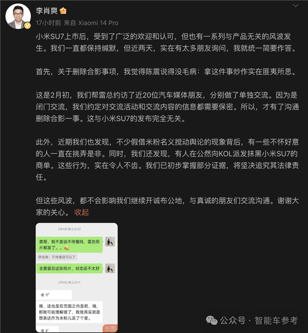 小米汽车副总裁李肖爽也出面证实,2月初雷总和20多位汽车媒体朋友交流。由于是闭门交流所以对活动和内容都需要保密,所以才和陈震沟通删除合影,而这件事却被拿来炒作“实在匪夷所思”。