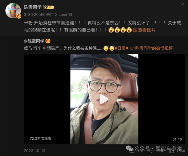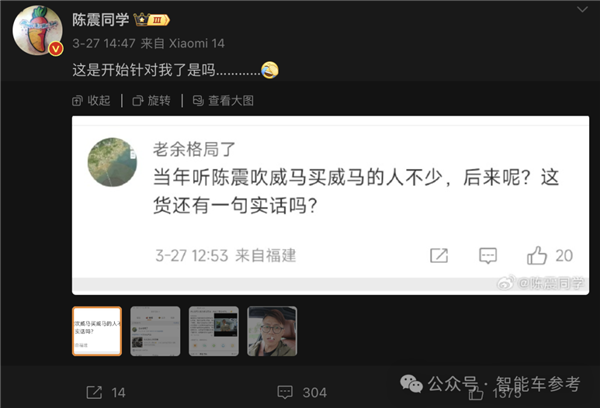 新闻一出,有人扒到陈震曾经对威马给出正面评价,对比他对小米SU7的评价,更加证明“被充值”的事情板上钉钉;甚至有人表示他因为陈震买了威马,现在不知道要怎么办。