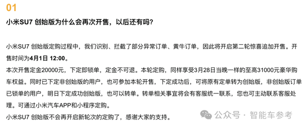 不过这次将是小米SU7创始版最后一次开放定购,如果还想定,那就只有等待其他人转单了。