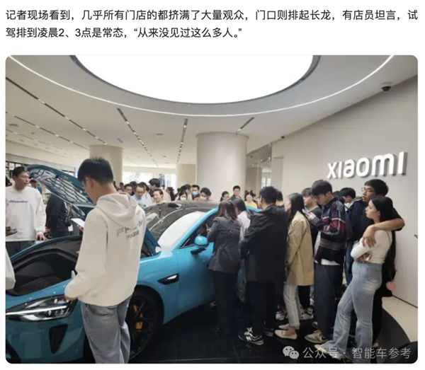 首先是线下门店里,想要看车的人大排长龙。有媒体报道,上海一小米汽车的门店日均人流量能达到1万左右,并且如果想看车还得要排队两个小时,人最多的时候能排到商场另一头。