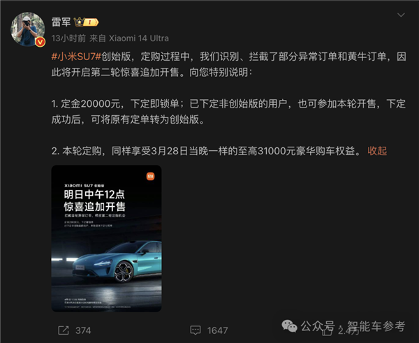 小米汽车APP下载量第一、看车要排队两小时,创始版订单还出现异常,雷军宣布二次追加开售,开售即售罄……