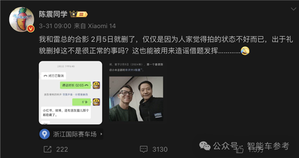 陈震澄清道,合影删除的时间是2月5日,因为拍的雷总状态不好,出于礼貌所以删除了。从这来看,确实不是小米SU7上市的时间点。
