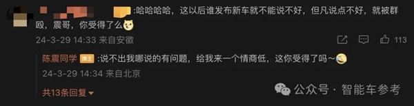 有网友觉得陈震这次评价小米汽车“带情绪”,有人说是鸡蛋里挑骨头,而陈震也没沉默,连续多天和网友对线。