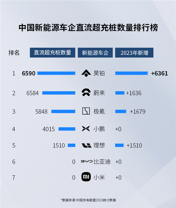 而中国充电联盟2023年数据显示,2023年,昊铂直流超充桩数量为6590根,超越蔚小理等新势力,成为直流超充桩最多的中国汽车品牌。
